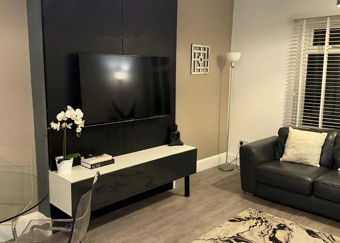 Featuring a patio and a seating area, Beautifully Designed Pollok House Apartment is complete with modern conveniences like a multi-channel TV to elevate your stay. The accommodation is also furnished with a sofa. A bathroom is equipped with a separate toilet, a bath, and a shower, as well as a hair dryer and towels.